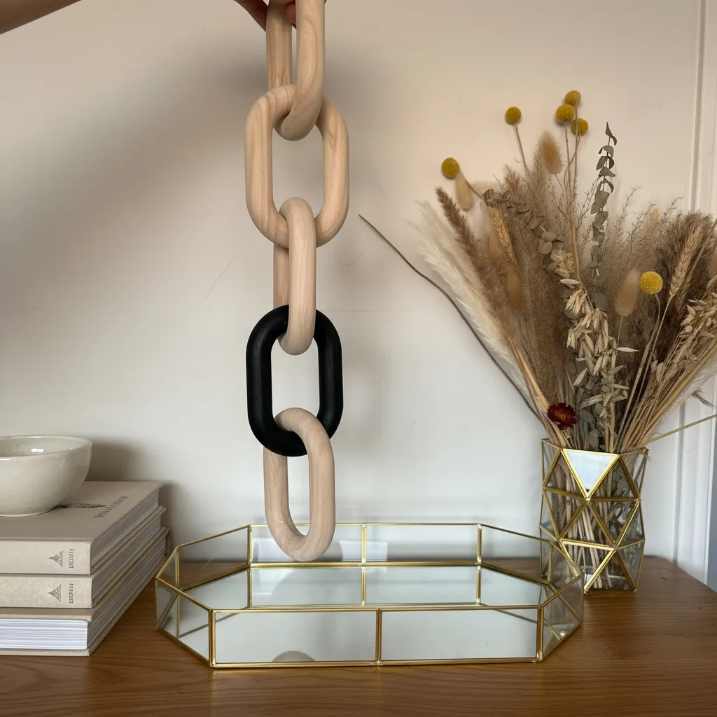 La cadena de eslabones de madera en color natural y negro beige es una opción versátil y elegante para la decoración de cualquier espacio. Su diseño atemporal se adapta a diferentes estilos, desde lo rústico hasta lo contemporáneo, aportando un toque de calidez y sofisticación.